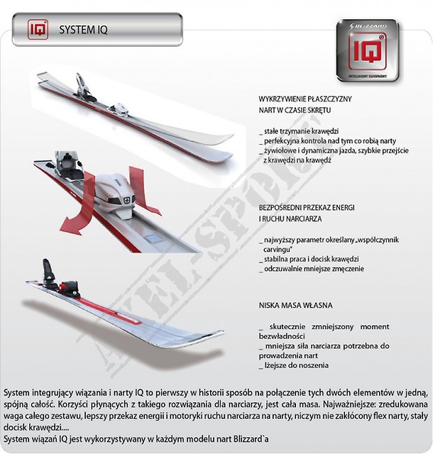 Seria G-Force łączy w sobie odpowiedzi na różne potrzeby - wszystko w jednej narcie. Wszechstronność konstrukcji i taliowania pozwala lekkie unoszenie w puchu ze stabilnością, kontrolą i żwawością na przygotowanym stoku. Konstrukcja: IQ Sandwich Composite Powerframe Taliowanie: 116/ 70 / 100 Promień skrętu: Promień skrętu 15,5M (167cm) Stopień zaawansowania: średni zaawansowani i zaawansowani narciarze Prędkość: średnia, duża Teren: Każdy teren Rodzaj narty: AllMountain Użytkownik: MĘSKIE Sezon: 2012/2013 Długości: 153cm / 160cm / 176cm IQ to niezawodny system, który bazuje na płycie wmontowanej w konstrukcję narty. Jest to jedyny system w pełni łączący nartę i wiązanie. Naturalne działanie oraz elastyczność narty nie są zakłócone w procesie produkcji przez wiercenie, przykręcanie czy klejenie poszczególnych elementów czy też samego wiązania. Jest to mocny system łączenia, który nie umniejsza eleastyczności narty oraz pozwala na szybki & łatwy montaż wiązania